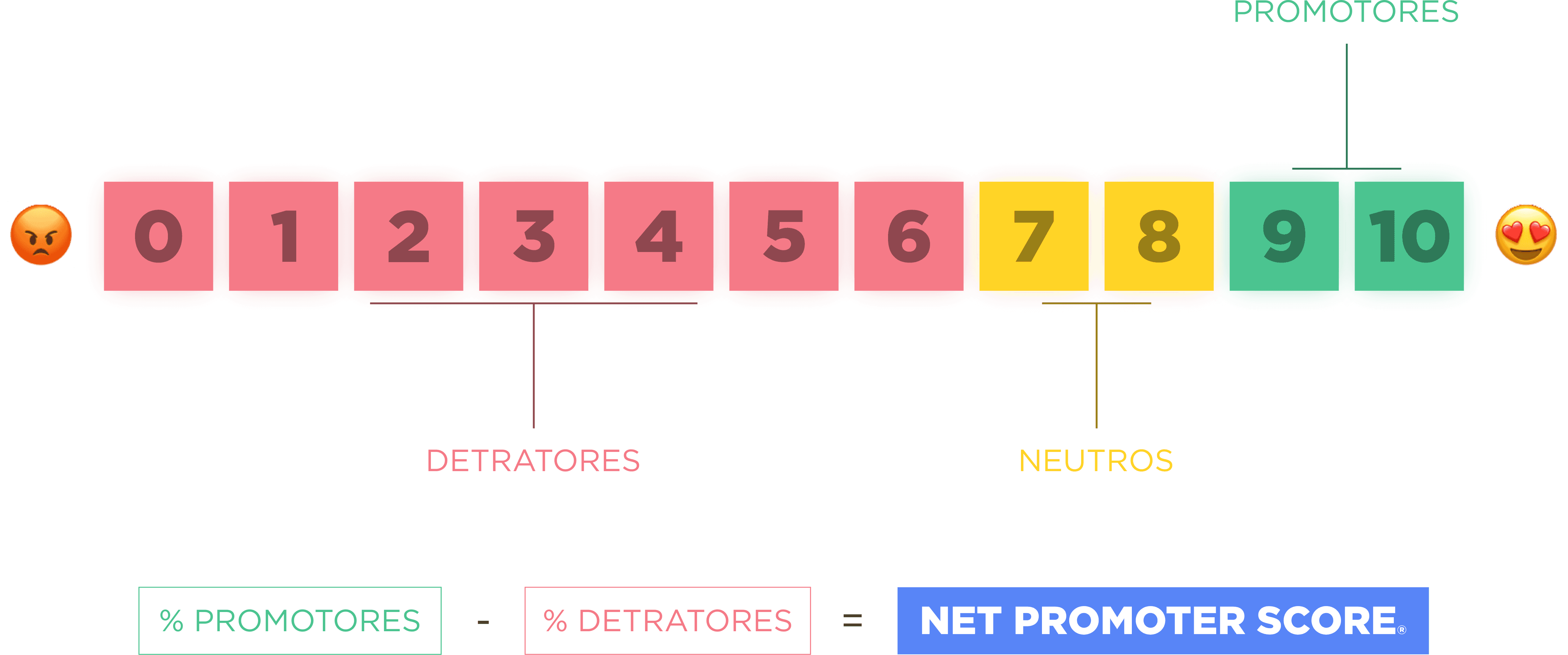 As respostas são divididas em três categorias: Promotores (notas 9-10), Neutros (notas 7-8) e Detratores (notas 0-6). O cálculo do NPS é feito subtraindo a porcentagem de Detratores da porcentagem de Promotores, resultando em um índice que varia de −100 a 100.